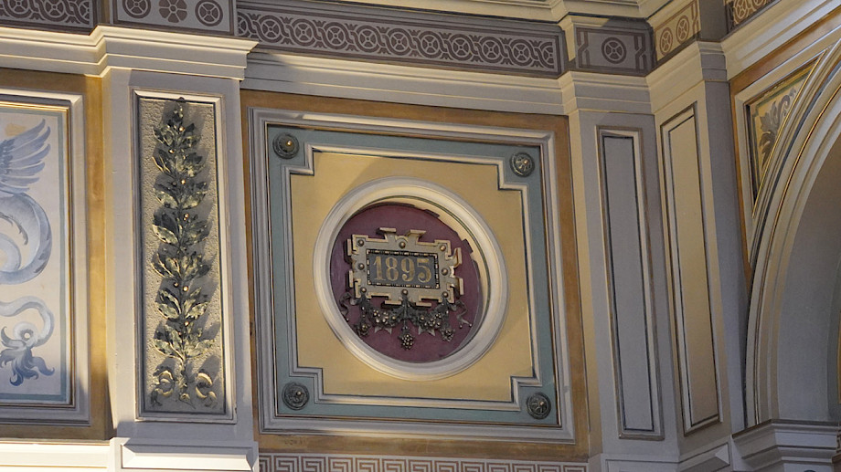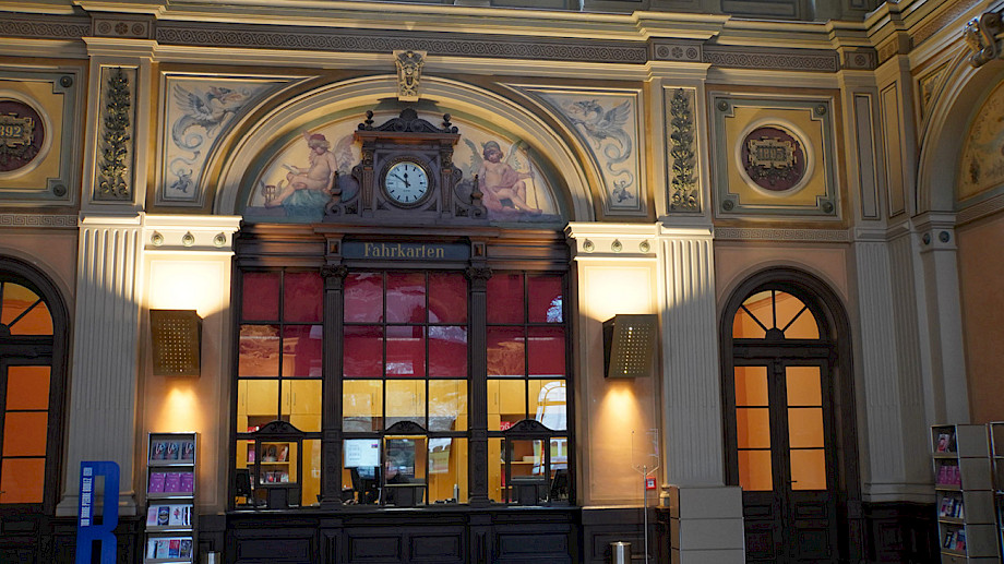 Aber beginnen wir von vorn, also beim Eingang. Wer ins Festspielhaus Baden-Baden kommt, findet sich erst einmal in einer üppig bemalten Schalterhalle wieder. Rechts oben findet sich in einer Vignette die Jahreszahl 1895: Damals wurde nicht nur die Tonhalle Zürich eröffnet, sondern auch der Bahnhof, zu dem diese Halle gehörte. «Fahrkarten» steht in mattgoldener Schrift denn auch nach wie für über den Schaltern. Aber die Billette, die man hier kauft, werden vom Zugpersonal längst nicht mehr akzeptiert – sie gelten ausschliesslich für musikalische Reisen.