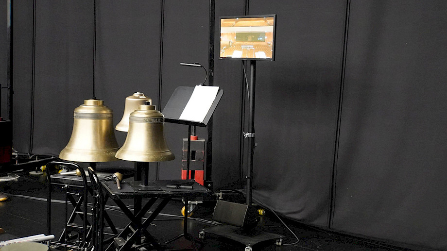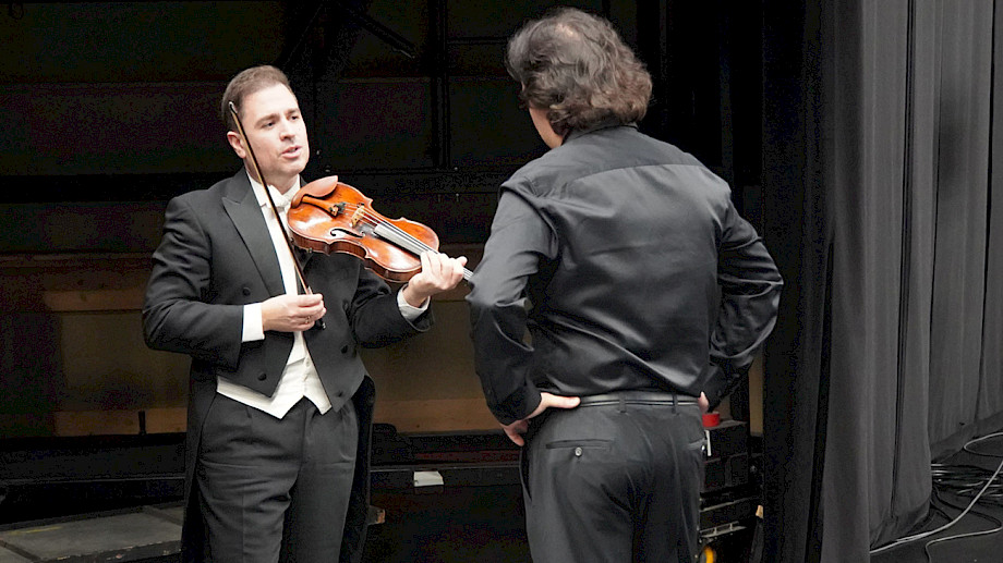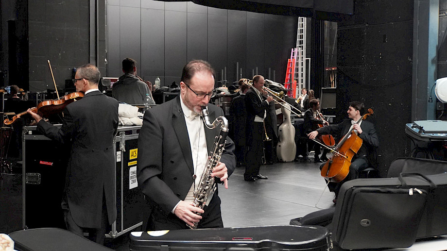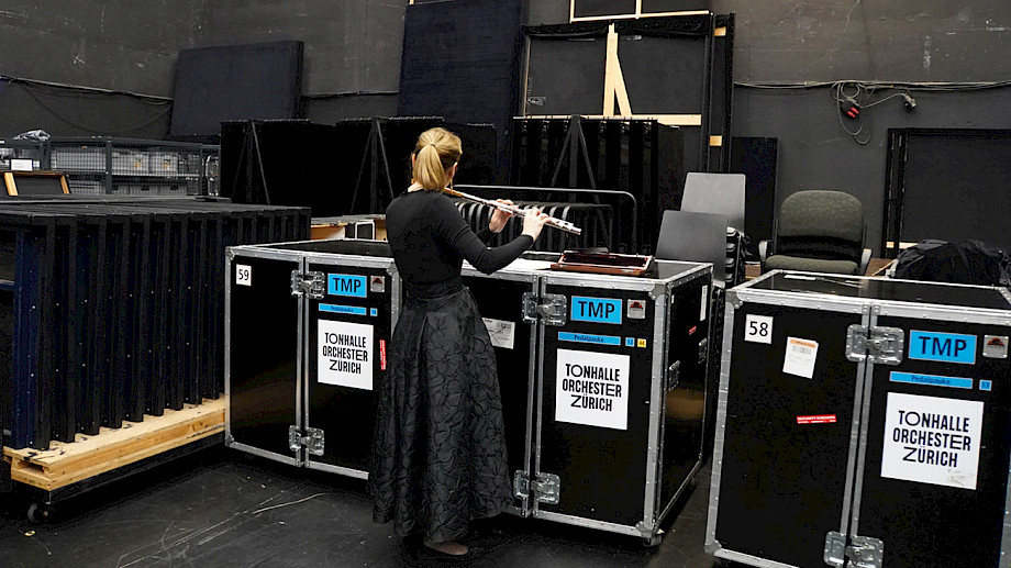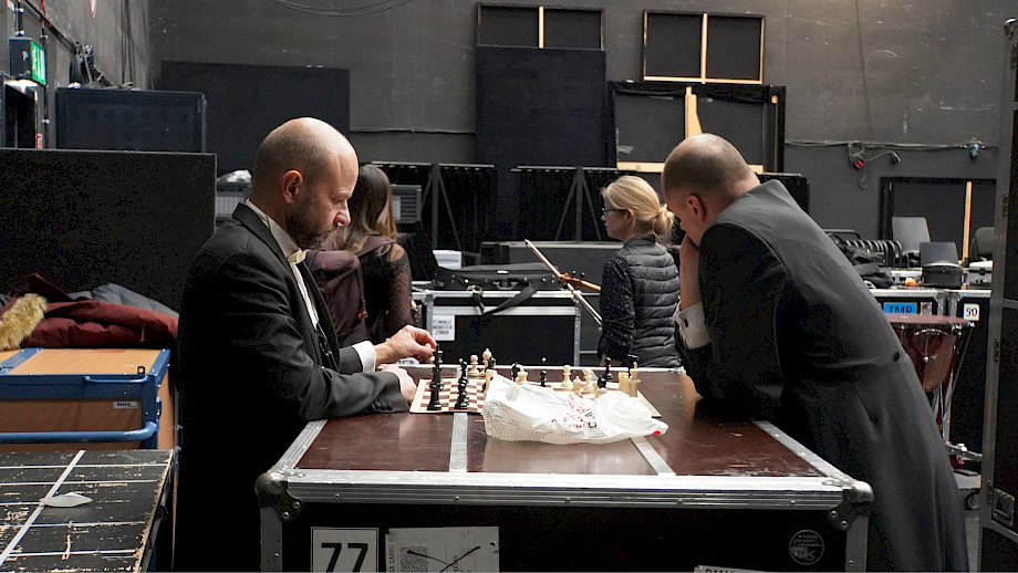Deshalb fuhren also vor ein paar Tagen mehrere Busse von Zürich nach Baden-Baden – die einen beladen mit Instrumenten, die anderen mit Musikerinnen und Musiker. Für die erste Runde der Residenz hatte man die Mahler-Sinfonien Nr. 1 und 2 im Gepäck. Und schon vor der Anspielprobe war klar, dass die Grösse des Saales sich auch hinter der Bühne spiegelt: Dort, wo normalerweise Opernkulissen auf ihren Einsatz warten, reihten sich nun die Instrumenten-Cases. Platz zum Einspielen gab es im Parkett und zwischen den Cases ebenfalls mehr als genug. Und klar: Auch für das Schachbrett der Kontrabassisten fand sich eine Ecke.